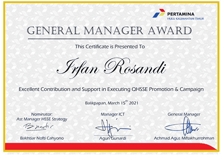 "Irfan has performed excellent work during his time at Pertamina - Regional 3. He support us on infographics, graphics design and also UI/UX support for our applications. I may categorized his skills as advance, match with his experience. Thank you for your support. I will not mind at all, if we can work together again in the future :) Good luck Irfan."